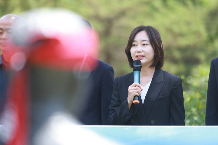 [서울=뉴시스] 권창회 기자 = 김재연 진보당 상임대표가 17일 오전 경기 남양주 민족민주열사묘역 내 전태일 열사 묘역을 참배 후 발언하고 있다.(사진=진보당 제공) 2024.06.17. [email protected] *재판매 및 DB 금지