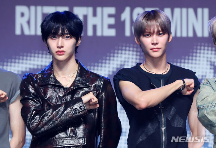 [서울=뉴시스] 김혜진 기자 = 그룹 라이즈(RIIZE) 원빈, 은석이 17일 오후 서울 용산구 블루스퀘어 마스터카드홀에서 열린 첫 번째 미니앨범 '라이징(RIIZING)' 프레스 프리미어 행사에서 포즈를 취하고 있다.