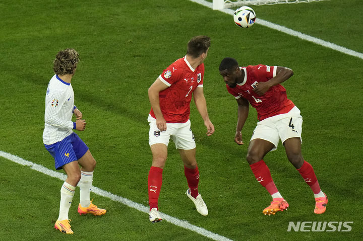 [뒤셀도르프=AP/뉴시스] 오스트리아(25위)의 막시밀리안 뵈버(가운데)가 17일(현지시각) 독일 뒤셀도르프의 메르쿠어 슈필 아레나에서 열린 2024 유럽축구선수권대회(유로 2024) 조별리그 D조 1차전 프랑스(2위)와의 경기 전반 38분 자책골을 기록하고 있다. 프랑스는 오스트리아의 자책골로 1-0으로 신승, 간신히 승점 3점을 챙겼으나 킬리안 음바페의 부상으로 향후 경기에도 지장이 예상된다. 2024.06.18.