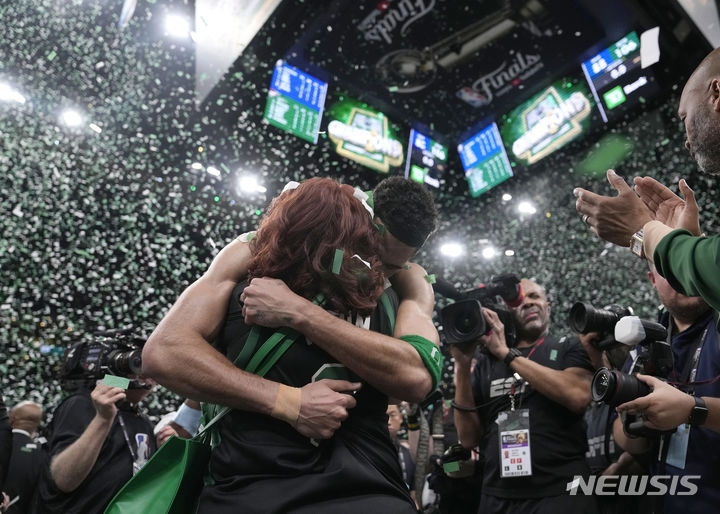 [보스턴=AP/뉴시스] 보스턴 셀틱스의 포워드 제이슨 테이텀(왼쪽)이 17일(현지시각) 미 매사추세츠주 보스턴의 TD 가든에서 열린 20223-24 미국 프로농구(NBA) 파이널 5차전에서 댈러스 매버릭스를 꺾고 우승한 후 어머니 브랜디 콜과 포옹하고 있다. 보스턴이 106-88로 이기고 시리즈 4승 1패로 우승하며 역대 최다인 18회 우승을 차지했다. 2024.06.18.