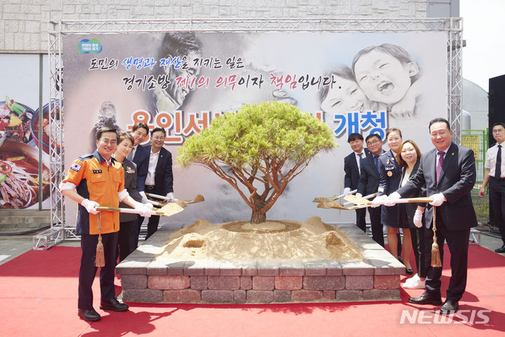[용인=뉴시스] 19일 경기 용인시 기흥구에 문을 연 용인서부소방서 개청식에 참석한 관계자들이 기념촬영을 하고 있다. (사진=경기도소방재난본부 제공) 2024.6.19. [email protected]