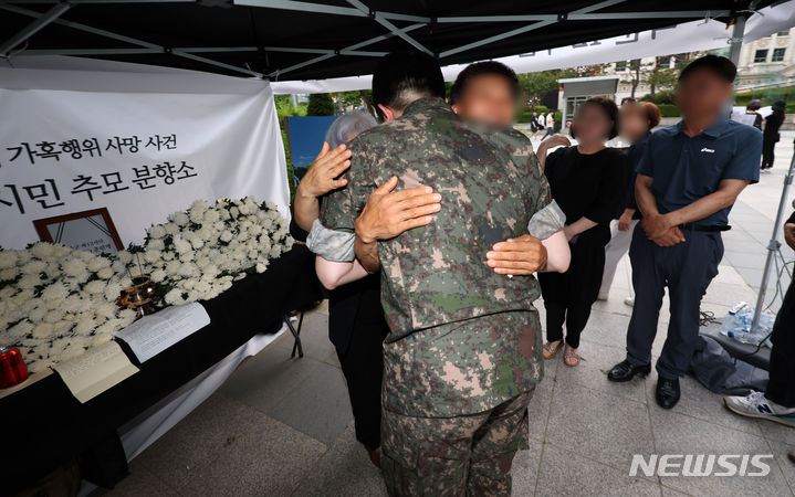 [서울=뉴시스] 홍효식 기자 = 19일 오후 서울 용산역 광장에 마련된 군기훈련(얼차려)을 받다 사망한 육군 12사단 신병교육대 박 훈련병 시민 추모 분향소를 찾은 한 예비군이 유족들을 위로하고 있다. 2024.06.19. [email protected]