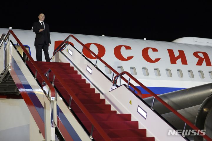 [평양=AP/뉴시스] 블라디미르 푸틴 러시아 대통령이 19일 평양 외곽 순안국제공항에서 베트남으로 떠나는 전용기에 오르며 김정은 북한 국무위원장에게 인사하고 있다. 2024.06.20.