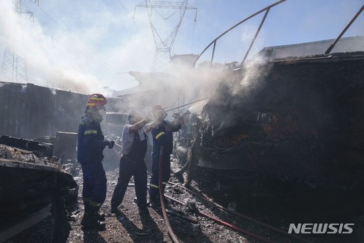 [아테네=AP/뉴시스] 19일(현지시각) 그리스 아테네 동부 코로피 화재 현장에서 소방관들이 불을 끄고 있다. 40도 넘는 무더위 속에 발생한 화재로 주민들이 긴급 대피하고 주요 고속도로가 봉쇄됐으며 강풍에 불길이 빠르게 번져 진화에 어려움을 겪고 있다. 2024.06.20.