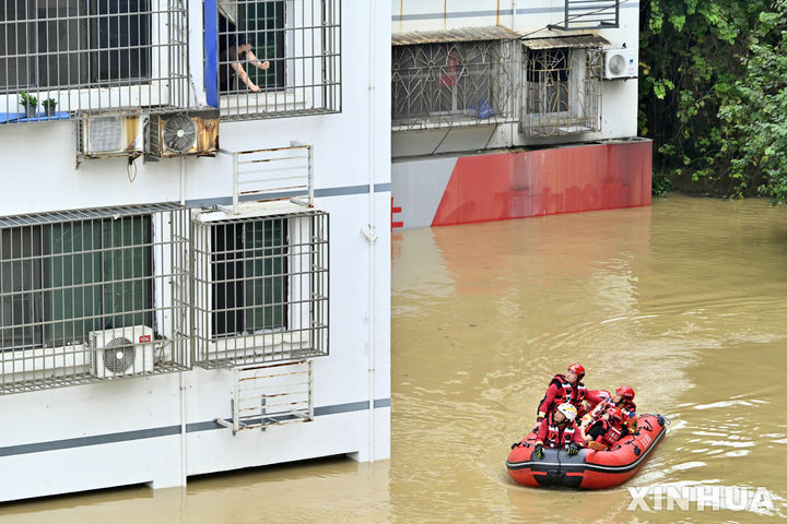 광시좡족자치구 홍수, 고립 주민 찾는 소방관들