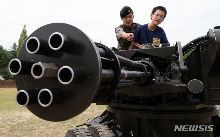 [세종=뉴시스] 강종민 기자 = 세종시 육군 32사단에서 20일 열린 참전용사 초청행사에서 어린이 참가자가 20mm 대공포(발칸)에 대한 설명을 듣고 있다. 2024.06.20. [email protected]