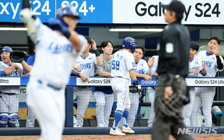 [대구=뉴시스] 이무열 기자 = 20일 대구 수성구 삼성라이온즈파크에서 열린 2024 신한 SOL 뱅크 KBO리그 SSG 랜더스와 삼성 라이온즈의 경기, 1회말 2사 1,2루 상황에서 삼성 김영웅의 1타점 적시타에 홈인한 2루 주자 김지찬이 더그아웃에 들어서며 동료들과 기뻐하고 있다. 2024.06.20. [email protected]