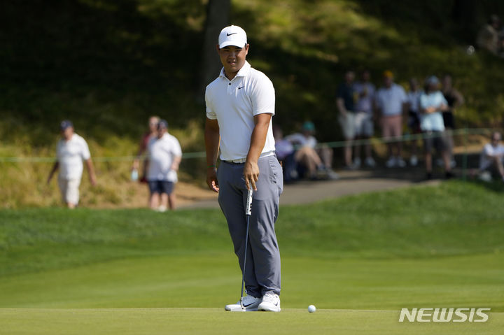 [크롬웰=AP/뉴시스] 김주형이 20일(현지시각) 미 코네티컷주 크롬웰의 TPC 리버 하일랜드에서 열린 미국프로골프(PGA) 투어 트래블러스 챔피언십 첫날 15번 홀에서 퍼팅하고 있다. 김주형은 8언더파 62타로 단독 선두에 올랐다. 2024.06.21.
