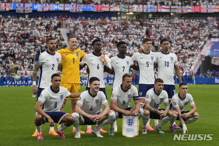 [프랑크푸르트=AP/뉴시스] 잉글랜드(4위) 선수들이 20일(현지시각) 독일 프랑크푸르트 아레나에서 열리는 2024 조별리그 C조 2차전 덴마크(21위)와의 경기에 앞서 기념 촬영하고 있다. 우승 후보 잉글랜드는 1-1로 비겨 1승1무(승점 4점)로 조 선두를 유지했지만, 16강 진출은 확정하지 못했다. 2024.06.21.