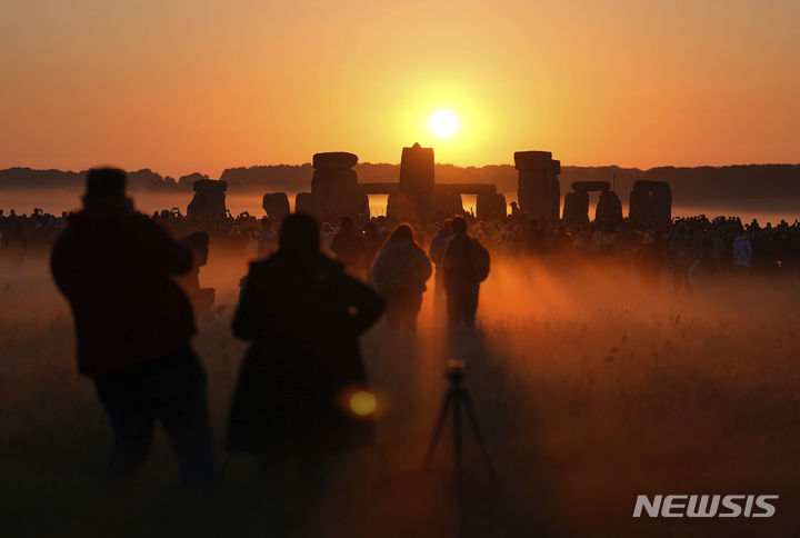 [윌트셔=AP/뉴시스] 21일(현지시각) 영구 윌트셔주 솔즈베리 평원의 스톤헨지에 모인 사람들이 '하지' 일출을 지켜보고 있다. 1년 중 낮의 길이가 가장 긴 하지에 떠오르는 태양과 스톤헨지의 중심축이 정확히 일치해 이를 보려는 사람들이 모여든다. 2024.06.21.