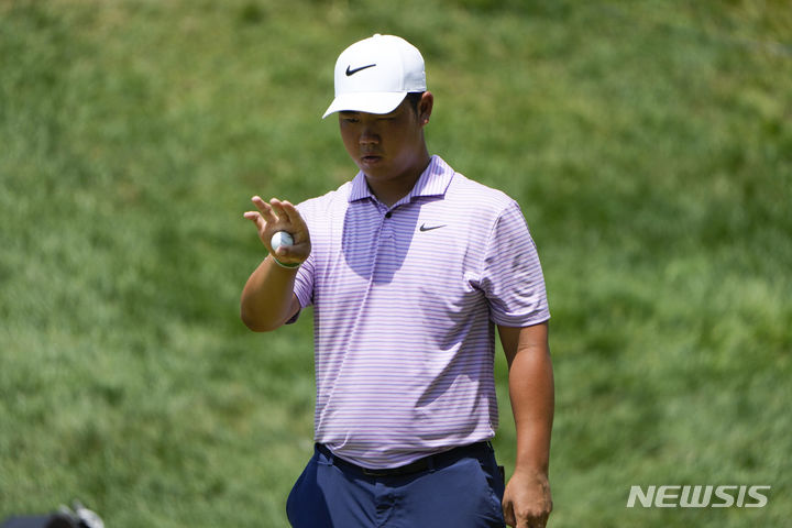 [크롬웰=AP/뉴시스] 김주형이 21일(현지시각) 미 코네티컷주 크롬웰의 TPC 리버 하일랜드에서 열린 미국프로골프(PGA) 투어 트래블러스 챔피언십 2라운드 18번 그린에서 라인업하고 있다. 김주형은 중간 합계 13언더파 127타로 첫날에 이어 단독 선두를 유지했다. 2024.06.22.