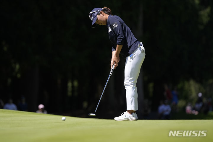 [서매미시=AP/뉴시스] 고진영이 21일(현지시각) 미 워싱턴주 서매미시의 사할리 컨트리클럽에서 개막한 KPMG 위민스 PGA 챔피언십 2라운드 8번 그린에서 퍼팅하고 있다. 첫날 공동 22위였던 고진영은 중간 합계 4언더파 140타 공동 2위권으로 올라섰다. 2024.06.22.