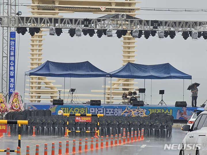 [태안=뉴시스] 김덕진 기자=태안 만리포해수욕장 개장일인 22일 비가 오는 궂은 날씨에 개장식 행사를 위해 차려놓은 무대만 덩그러니 놓여 있어 지나는 이들의 안타까움을 자아낸다. 태안군에 따르면 식전 공연은 오후 1시부터 예정대로 진행된다. 2024.06.22. [email protected]
