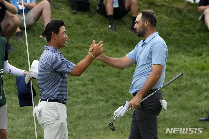 [크롬웰=AP/뉴시스] 김주형(왼쪽)이 23일(현지시각) 미 코네티컷주 크롬웰의 TPC 리버 하일랜드에서 열린 미국프로골프(PGA) 투어 트래블러스 챔피언십 최종 라운드 연장전에서 스코티 셰플러(미국)에게 우승을 내준 후 축하하고 있다. 3라운드까지 선두를 달렸던 김주형은 최종 합계 22언더파 258타로 셰플러와 동타를 이뤄 연장 끝에 아쉽게 패하며 준우승했다. 2024.06.24.