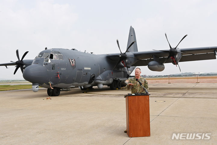 [평택=뉴시스] 김종택 기자 = 24일 경기도 평택시 주한미군 오산공군기지에서 미 특수전사령부 AC-130J가 공개되고 있다.