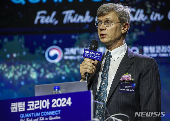 [고양=뉴시스] 정병혁 기자 = 미카일 루킨 하버드대학교 교수가 25일 경기 고양시 킨텍스에서 열린 퀀텀코리아 2024에서 양자컴퓨팅/양자인터넷 기술 분야 특별 강의를 하고 있다. 2024.06.25. [email protected]