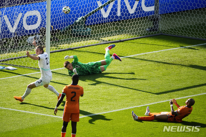 [베를린=AP/뉴시스] 네덜란드(7위)의 도니얼 말런(오른쪽)이 25일(현지시각) 독일 베를린의 올림피아슈타디온 베를린에서 열린 유로 2024 조별리그 D조 3차전 오스트리아(25위)와의 경기 전반 6분 자책골을 기록하고 있다. 오스트리아가 네덜란드를 3-2로 꺾고 조 1위로 16강에 올랐다. 2024.06.26.