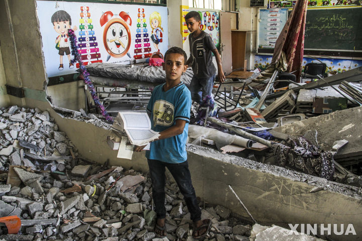 [가자지구=신화/뉴시스] 25일(현지시각) 가자지구 가자시티 서쪽 알샤티 난민촌에서 팔레스타인 어린이들이 이스라엘의 공습으로 파괴된 학교 교실을 살피고 있다. 팔레스타인 당국은 이스라엘이 가자시티에 있는 2개의 학교를 공습해 팔레스타인 주민 최소 26명이 숨졌다고 밝혔다. 2024.06.26.