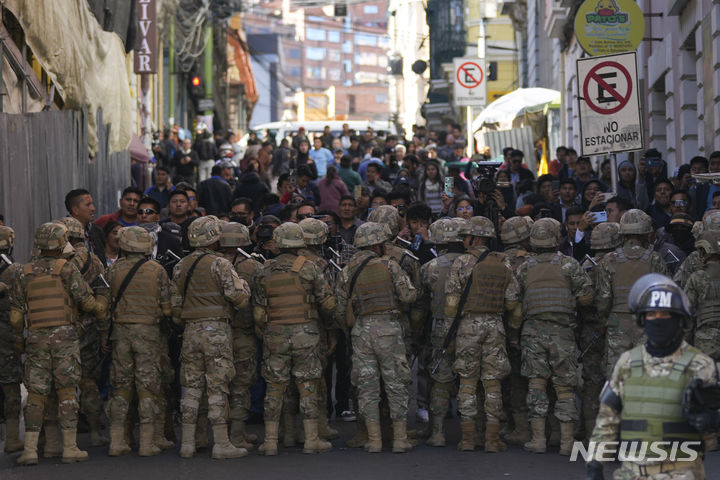 [라파스=AP/뉴시스] 26일(현지시각) 볼리비아군 헌병대가 라파스에 있는 무리요 광장 입구를 통제하고 있다. 볼리비아 군부가 전차와 장갑차 등을 동원해 대통령궁에 진입해 쿠데타를 시도한 것으로 알려졌다. 2024.06.27.