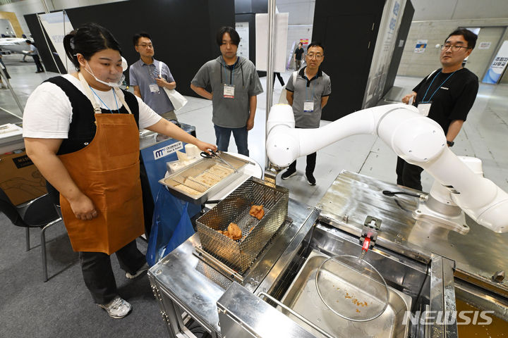 [광주=뉴시스] 이영주 기자 = 27일 오후 광주 서구 김대중컨벤션센터에서 2024 광주미래산업 엑스포 행사가 열리고 있다. 행사 현장에 마련된 로봇 튀김기가 튀김을 튀겨내고 있다. 2024.06.27. [email protected]