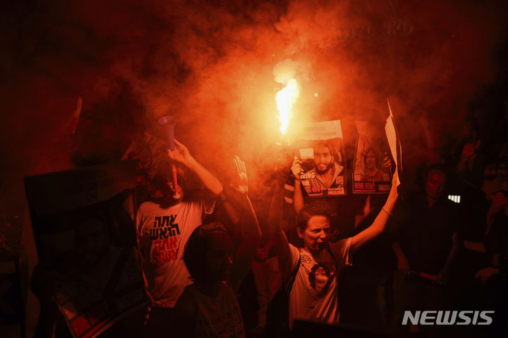 [예루살렘=AP/뉴시스] 27일(현지시각) 이스라엘 예루살렘에서 시위대가 베냐민 네타냐후 이스라엘 총리 정부를 비난하면서 하마스 무장단체에 의해 가자지구에 억류된 이스라엘 인질들의 석방을 요구하고 있다. 2024.06.28.