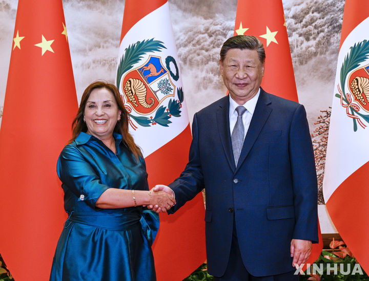 [베이징=신화/뉴시스] 시진핑(오른쪽) 중국 국가주석이 28일 베이징 인민대회당에서 중국을 국빈 방문한 디나 볼루아르테 페루 대통령과 회담 전 악수하고 있다. 시 주석은 "중국은 페루와의 관계 발전을 매우 중시하며 정치적 상호신뢰를 바탕으로 실무협력을 심화하고 다자간 조율을 강화해 페루와 전면적 전략동반자 관계를 새로운 단계로 발전시킬 의향이 있다"라고 말했다. 2024.06.29.
