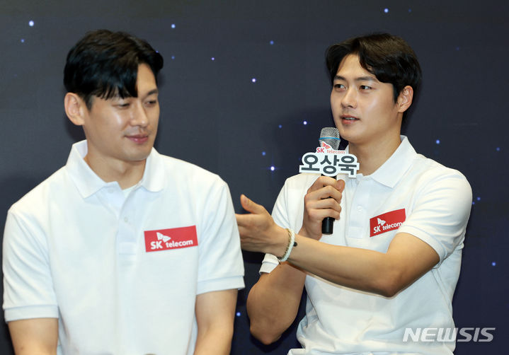 [서울=뉴시스] 고범준 기자 = 펜싱 국가대표 오상욱과 구본길이 29일 오후 서울 중구 SK T-타워 수펙스홀에서 열린 Team SK 2024 파리 올림픽 출정식에서 사회자 질문에 답변하고 있다. 2024.06.30. [email protected]