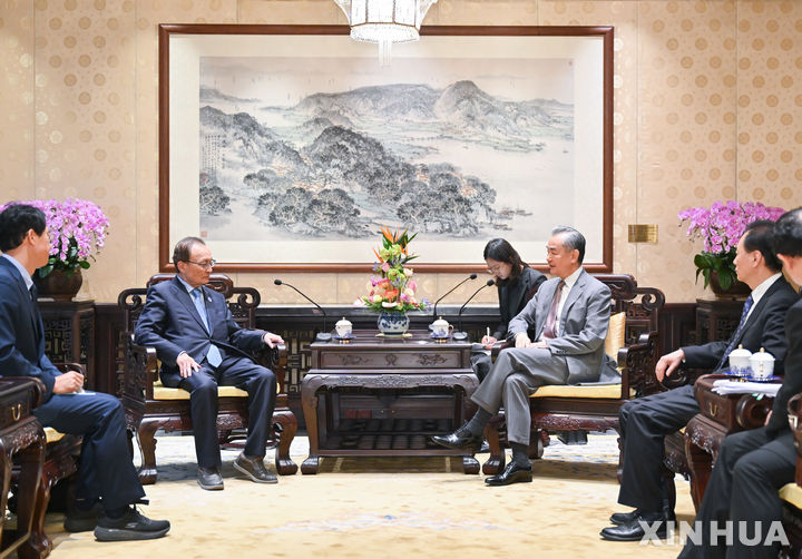 [베이징=신화/뉴시스] 이해찬(왼쪽) 전 총리가 29일 베이징 인민대회당에서 열린 '제70주년 평화공존 5원칙 기념 대회'에 참석차 중국을 방문해 왕이 중국 외교부장과 회담하고 있다. 2024.06.30.