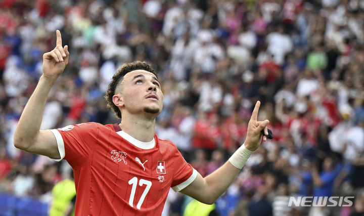 [베를린=AP/뉴시스] 스위스(19위)의 루벤 바르가스가 29일(현지시각) 독일 베를린의 올림피아 슈타디온에서 열린 유로 2024 이탈리아(10위)와 16강전 후반 1분 추가 골을 넣은 후 세리머니하고 있다. 스위스가 '디펜딩 챔피언' 이탈리아를 2-0으로 완파하고 8강에 올랐다. 2024.06.30.