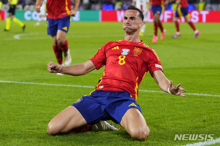 [쾰른=AP/뉴시스] 스페인(8위)의 파비안 루이스가 지난달 30일(현지시각) 독일 쾰른 슈타디온에서 열린 2024 16강전 조지아(74위)와 경기 후반 6분 팀의 두 번째 골을 넣고 세리머니하고 있다. 전반 18분 자책골을 내준 스페인은 이후 4골을 몰아쳐 4-1로 승리하고 8강에 합류했다. 2024.07.01.