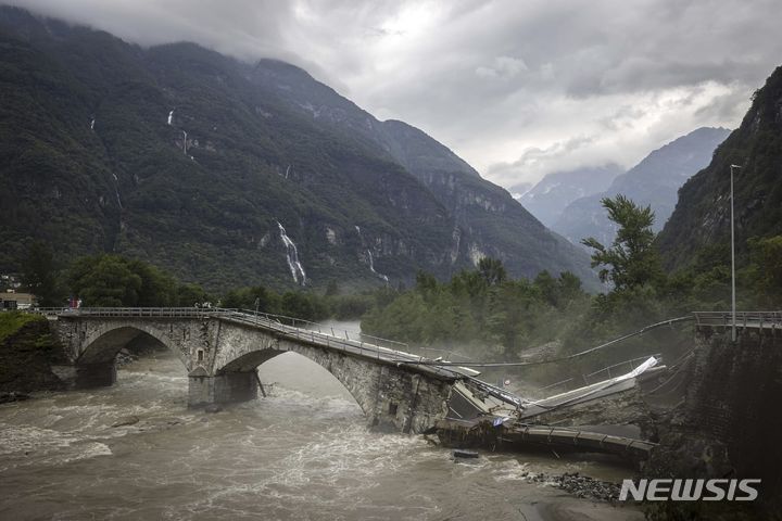 [비슬레토=AP/뉴시스] 지난달 30일(현지시각) 스위스 마지아 밸리 비슬레토의 교량이 폭풍우 여파로 무너져 있다. 현지 당국은 스위스와 이탈리아 북부 지역에 몰아친 폭풍으로 홍수와 산사태가 발생해 최소 4명이 숨졌다고 밝혔다. 2024.07.01.