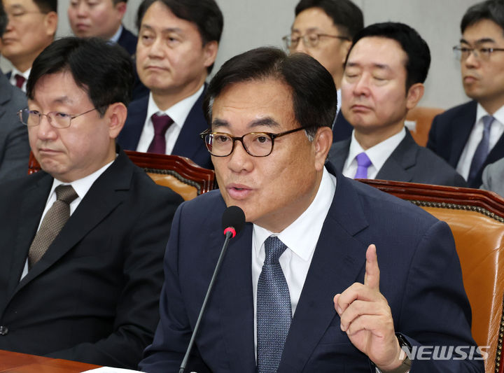 [서울=뉴시스] 조성우 기자 = 정진석 대통령 비서실장이 1일 오전 서울 여의도 국회에서 열린 운영위원회 전체회의에서 의원 질의에 답변하고 있다. 왼쪽 위는 김주현 민정수석. 2024.07.01. [email protected]