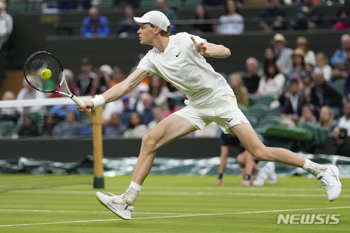 [런던=AP/뉴시스] 얀니크 신네르(1위·이탈리아)가 1일(현지시각) 영국 런던의 올잉글랜드 클럽에서 열린 윔블던 테니스대회 1회전 야니크 한프만(110위·독일)과 경기하고 있다. 올해 호주 오픈 우승자인 신네르가 3-1(6-3 6-4 3-6 6-3)로 승리하고 2회전에 올랐다. 2024.07.02.