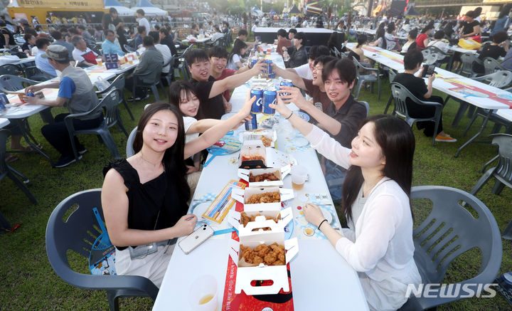 [대구=뉴시스] 이무열 기자 = 3일 오후 대구 달서구 두류공원 2.28 자유광장에서 열린 ‘2024 대구 치맥 페스티벌’을 찾은 시민들이 시원한 맥주와 치킨을 먹으며 축제를 즐기고 있다. 2024.07.03. [email protected]