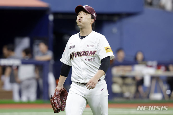 [서울=뉴시스] 최동준 기자 = 3일 서울 구로구 고척스카이돔에서 열린 2024 KBO리그 LG 트윈스 대 키움 히어로즈의 경기, 8회 키움 김성민이 무실점을 기록한 뒤 덕아웃으로 들어오고 있다. 2024.07.03. [email protected]