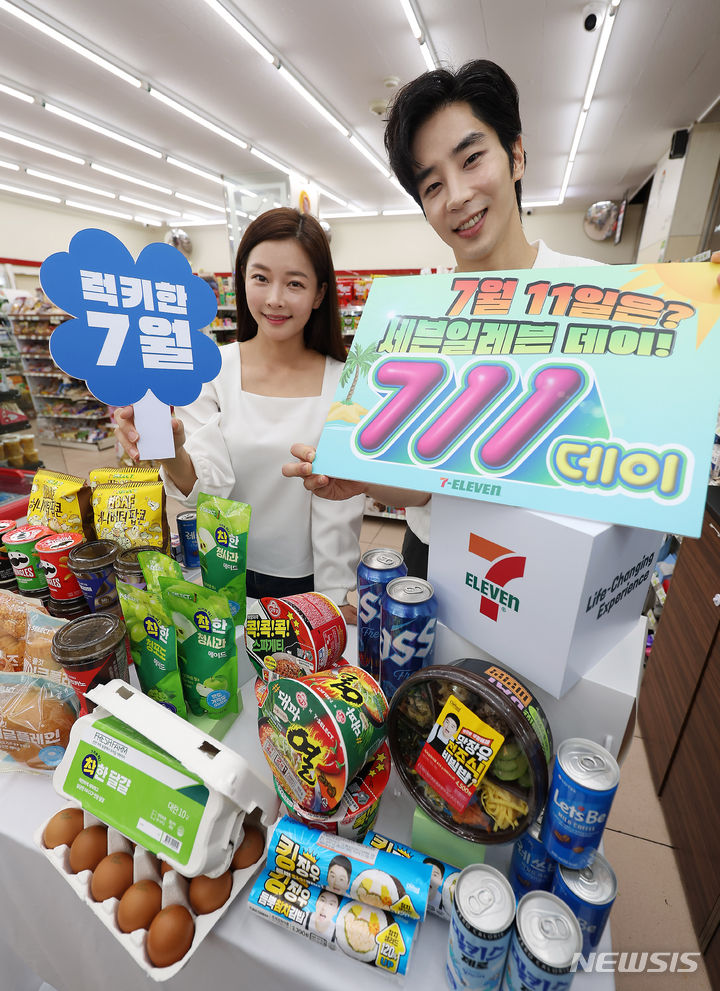 [서울=뉴시스] 김명년 기자 = 4일 오전 서울 중구 세븐일레븐 소공점에서 모델들이 '세븐일레븐데이(7-11 데이)'를 소개하고 있다.