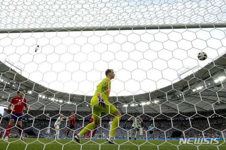 [슈투트가르트=AP/뉴시스] 독일(16위) 수문장 마누엘 노이어가 5일(현지시각) 독일 슈투트가르트 아레나에서 열린 유로 2024 8강전 스페인(8위)과의 연장 후반 14분 스페인의 결승 골을 허용하고 있다. 스페인은 연장 접전 끝 독일을 2-1로 꺾고 4강에 올라 포르투갈(6위)을 꺾은 프랑스(2위)와 결승행을 다툰다. 2024.07.06.