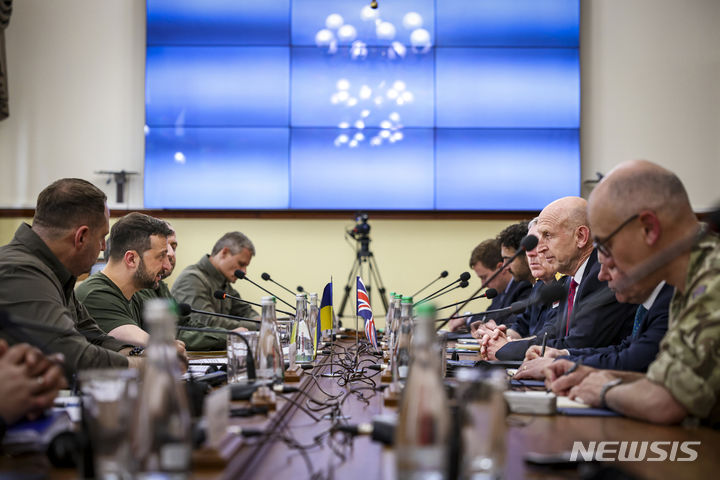 [오데사=AP/뉴시스] 볼로디미르 젤렌스키(왼쪽 두 번째) 우크라이나 대통령이 7일(현지시각) 우크라이나 오데사에서 존 힐리 신임 영국 국방부 장관과 회담하고 있다. 힐리 장관은 취임 48시간도 되지 않아 우크라이나를 방문해 미사일과 탄약 등의 지원을 발표하면서 지난 정부가 지난 4월 약속했던 지원을 100일 이내로 이행하겠다고 밝혔다. 2024.07.08.