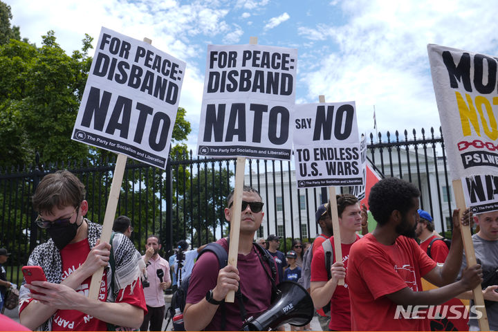 [워싱턴=AP/뉴시스] 오는 11일(현지시각) 미국 워싱턴 D.C.에서 열리는 북대서양조약기구(나토·NATO) 정상 회의를 앞두고 7일 백악관 앞에서 다양한 단체의 사람들이 손팻말을 들고 시위하고 있다. 2024.07.08.