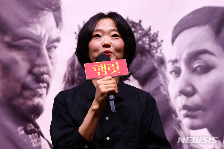 [서울=뉴시스] 김근수 기자 = 국립극단 연극 '햄릿'에서 햄릿 공주 역을 맡은 이봉련 배우가 8일 서울 중구 국립극단 명동예술극장에서 열린 국립극단 연극 '햄릿' 기자간담회에서 공연 소개를 하고 있다. 2024.07.08. [email protected]