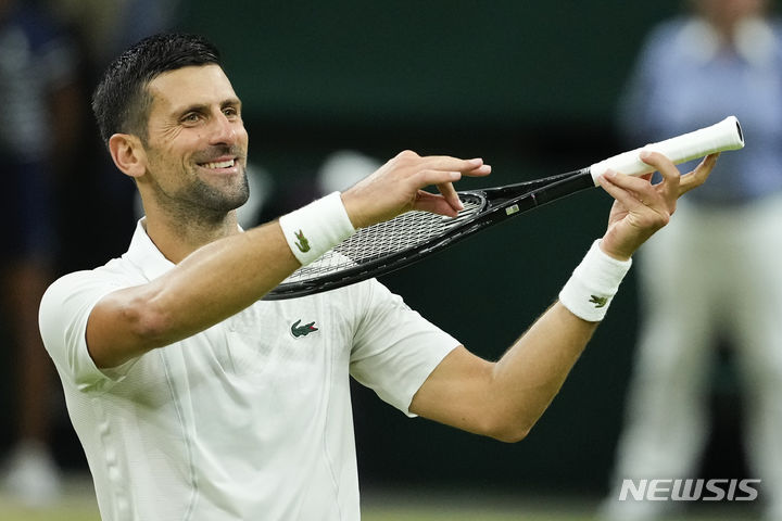 [런던=AP/뉴시스] 노바크 조코비치(2위·세르비아)가 8일(현지시각) 영국 런던의 올잉글랜드 클럽에서 열린 윔블던 테니스대회 남자 단식 4회전에서 홀게르 루네(15위·덴마크)를 꺾은 후 세리머니하고 있다. 조코비치가 3-0(6-3 6-4 6-2)으로 승리하고 8강에 올라 알렉스 드 미노(9위·호주)와 4강 진출을 다툰다. 2024.07.09.