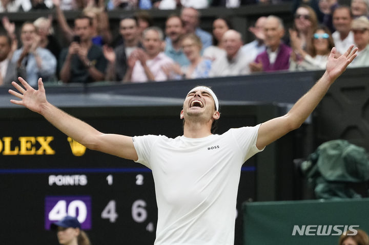 [런던=AP/뉴시스] 테일러 프리츠(12위·미국)가 8일(현지시각) 영국 런던의 올잉글랜드 클럽에서 열린 윔블던 테니스대회 남자 단식 4회전에서 알렉산더 즈베레프(4위·독일)를 꺾은 후 환호하고 있다. 프리츠는 풀세트 접전 끝에 3-2(4-6 6-7 6-4 7-6 6-3)로 역전승을 거두고 힘겹게 8강에 올라 로렌조 무세티(25위·이탈리아)와 4강 진출을 다툰다. 2024.07.09.