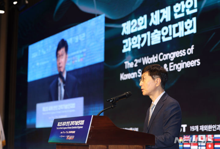 [서울=뉴시스] 김명년 기자 = 박남규 성균관대학교 교수가 10일 오전 서울 강남구 과학기술회관에서 열린 '제2회 세계 한인 과학기술인대회'에서 대한민국 최고과학기술인상 수상 소감을 밝히고 있다. 2024.07.10. [email protected]