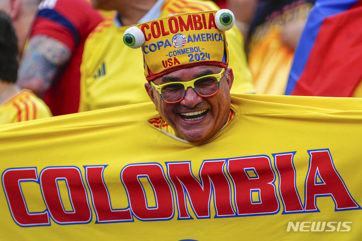 [샬럿=AP/뉴시스] 콜롬비아 축구 팬이 10일(현지시각) 미 노스캐롤라이나주 샬럿의 뱅크오브아메리카 스타디움에서 열리는 2024 코파 아메리카 준결승 콜롬비아(12위)와 우루과이(14위)의 경기에 앞서 응원을 펼치고 있다. 전반 추가시간 1명이 퇴장당한 콜롬비아가 1-0으로 승리하고 결승에 올라 2연패를 노리는 아르헨티나(1위)와 우승을 다툰다. 2024.07.11.
