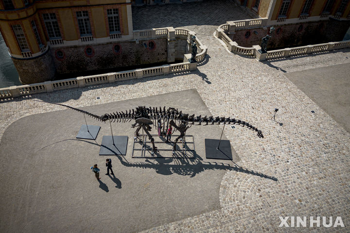 [파리=신화/뉴시스] 10일(현지시각) 프랑스 파리 남부 담피에르 앙 이블린 성에서 경매를 앞둔 초식공룡 아파토사우루스의 골격 모형이 전시돼 있다. 몸길이 21m에 달하는, 약 1억5천만 년 전의 이 모형은 오는 11월 경매에 나온다. 2024.07.11.