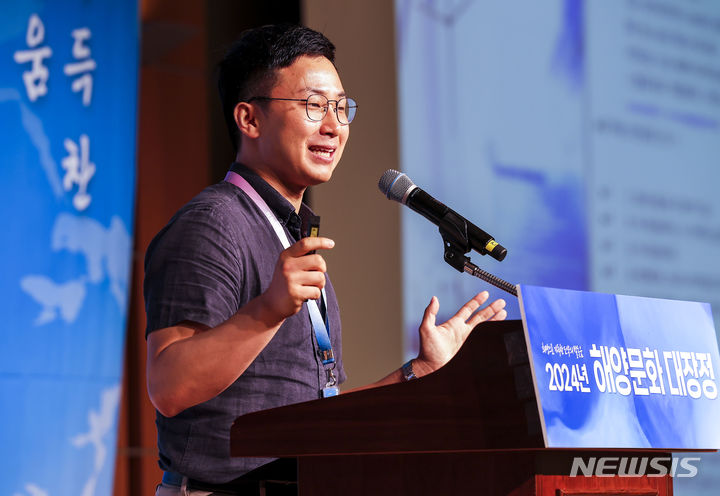 [서울=뉴시스] 정병혁 기자 = 장세현 전남대학교 교수가 11일 서울 용산구 백범김구기념관 컨벤션홀에서 열린 2024년 해양문화대장정 발대식에서 특강을 하고 있다. 해양수산부가 주최하고 한국해양재단이 주관해 11일부터 18일까지 7박8일의 일정으로 진행되는 올해 해양문화 대장정은 희망팀(동해)과 도약팀(서해)으로 나눠 독도(최동단), 백령도(최북단) 등 우리나라 끝단 도서와 주요 해양 영토를 탐방하며 다양한 해양 문화와 역사를 체험한다. 2024.07.11. [email protected]