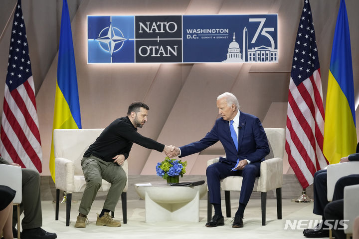 [워싱턴=AP/뉴시스] 조 바이든 미국 대통령(오른쪽)과 볼로디미르 젤렌스키 우크라이나 대통령이 11일(현지시각) 워싱턴DC에서 열린 나토(NATO) 정상회의를 계기로 양자 회담을 하고 있다. 2024.07.12.