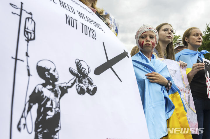 [제네바=AP/뉴시스] 11일(현지시각) 스위스 제네바의 유엔 유럽본부 앞에서 전쟁 반대 시위가 열려 시위대가 포스터와 우크라이나 국기를 들고 있다. 조 바이든 미국 대통령은 우크라이나의 방공망을 강화하기 위해 패트리엇 미사일 시스템을 포함한 2억2500만 달러(약 3천억 원)의 새로운 우크라이나 추가 지원 계획을 발표했다. 2024.07.12.