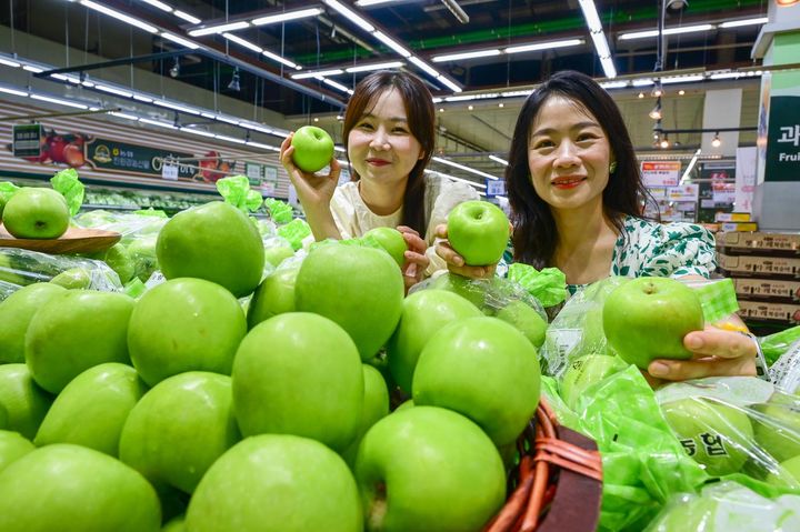 [서울=뉴시스] 12일 서울 서초구 농협 하나로마트 양재점에서 모델들이 국내산 품종 '썸머킹' 사과를 소개하고 있다. 썸머킹은 일본 품종 중 아오리 사과라고도 부르는 '쓰가루'를 대체하기 위해 농촌진흥청 사과연구소에서 개발된 국내산 신품종이다. (사진=농협유통 제공) 2024.07.12. [email protected] *재판매 및 DB 금지
