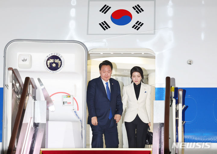 [성남=뉴시스] 최진석 기자 = 윤석열 대통령과 부인 김건희 여사가 12일 북대서양조약기구(NATO·나토) 75주년 정상회의 등 미국 안보순방을 마치고 귀국, 성남 서울공항에 도착해 공군 1호기에서 내리고 있다. 2024.07.12. [email protected]